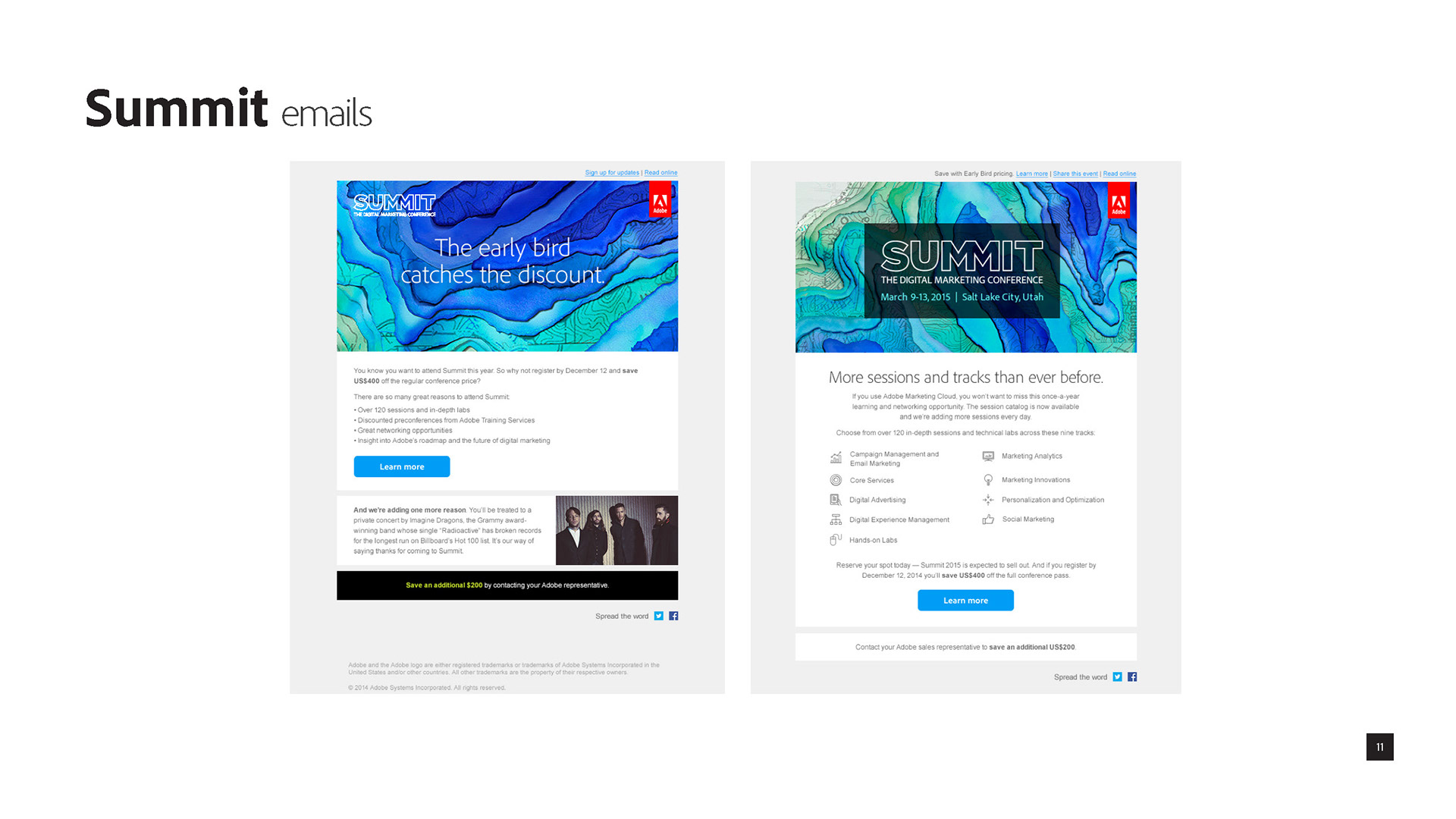 For the tenth year in a row, I lead creative direction for Adobe Summit: The Digital Marketing Conference. Each year we pick a new theme, and this year, we built on the previous year's theme of marketing reinvention. Having started that campaign in 2014, we thought it made sense to continue that storyline with the line "Reinvention is a journey. Start yours at Summit." To represent that, my team and I came up with the idea of a topographical view of landscapes. We again tapped our friends at Vasava to help us bring these illustrations life. Here are just a few of the samples of how the artwork came to life for different regions.